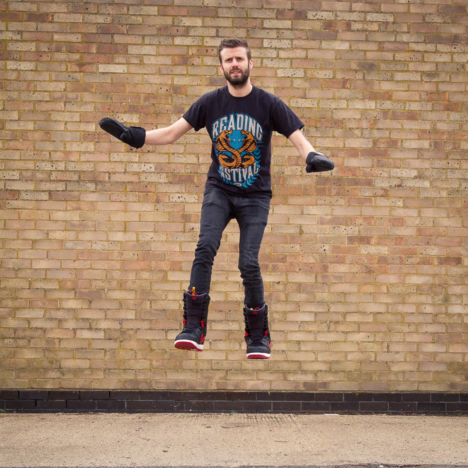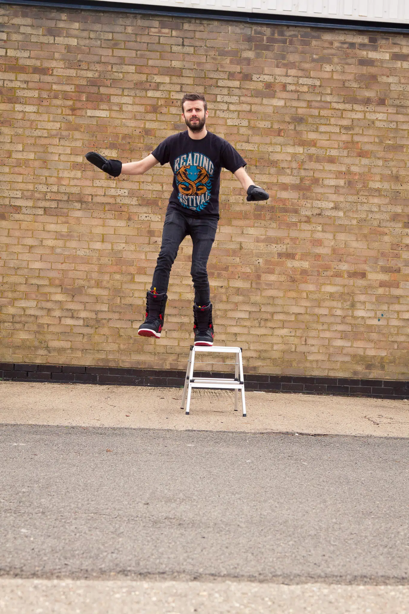 The first step was to convince somebody to be in the photograph, this is never easy but their web developer finally agreed to don a pair of my snowboarding boots and hopped himself up onto a small stepladder. We spent a few minutes working our way through a few different poses to make it look like he was hovering, in the end though the best poses were the moment he started to fall off the ladder sideways as it took all the rigidity out of the pose and made it look like he could actually be hovering.